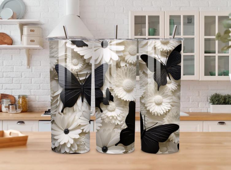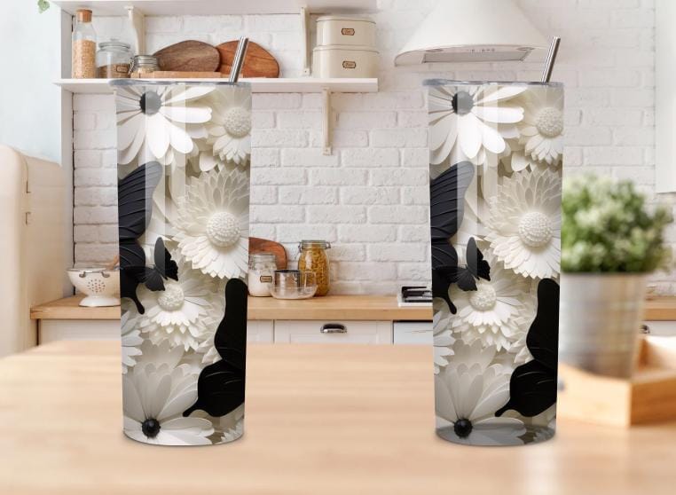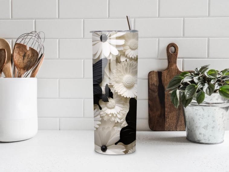 Bring elegance and nature together with this beautiful Floral Butterfly Skinny Tumbler. Featuring soft daisy flowers and striking black butterflies, this tumbler is perfect for anyone who loves floral designs, cottagecore style, and nature-inspired drinkware.
