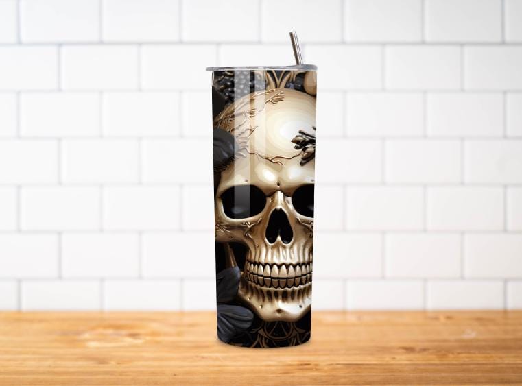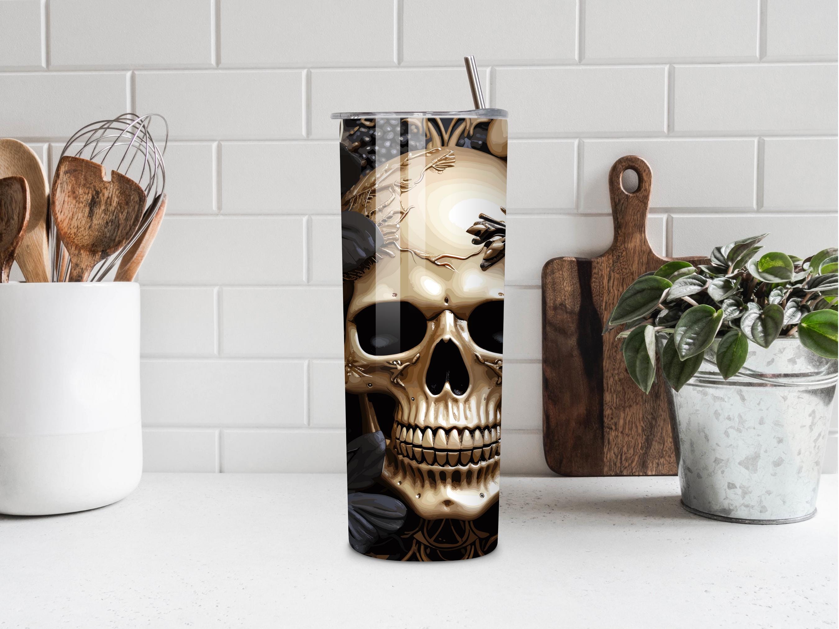 This stunning 20oz stainless steel tumbler features a bold gothic skull design with elegant black and gold floral details. Perfect for lovers of dark aesthetics, gothic decor, and edgy luxury drinkware.