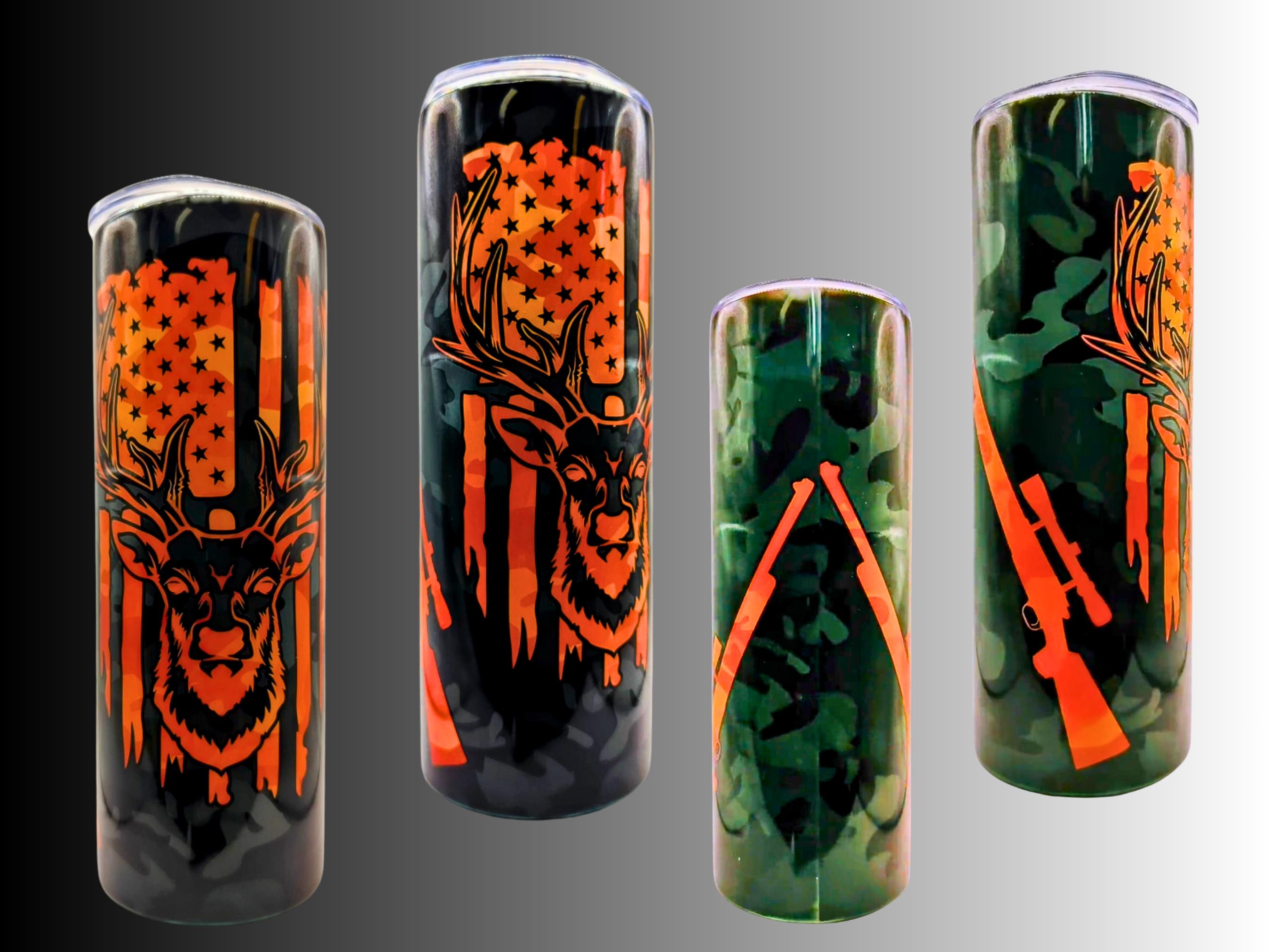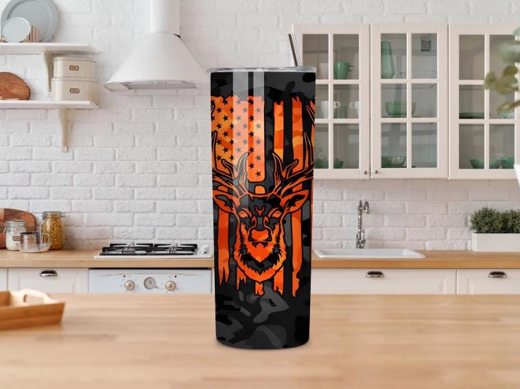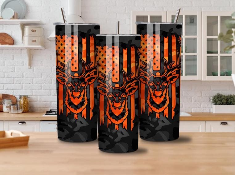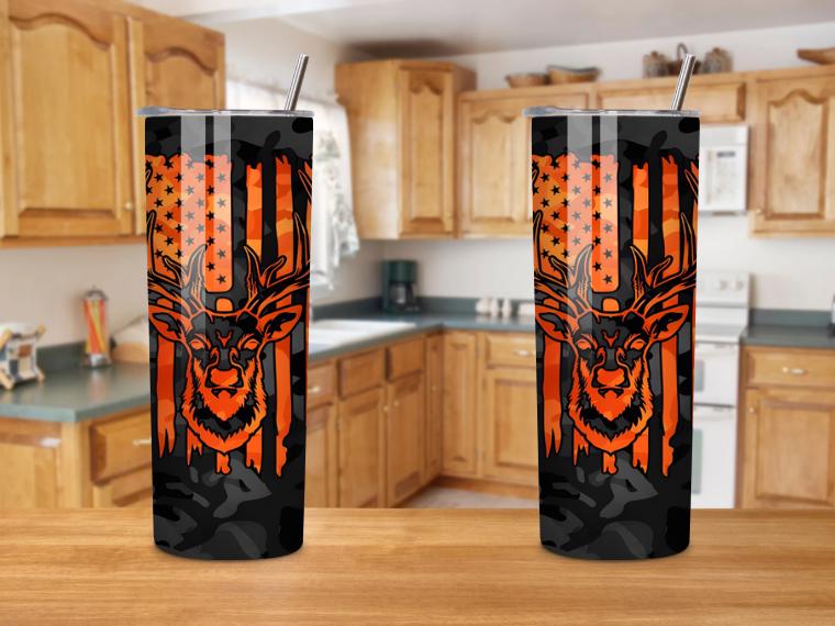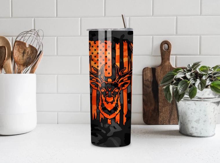 This 20oz hunting tumbler with deer and American flag design is perfect for hunters and outdoor lovers. Featuring a camo background and bold orange details, this stainless steel tumbler keeps drinks hot or cold for hours.
