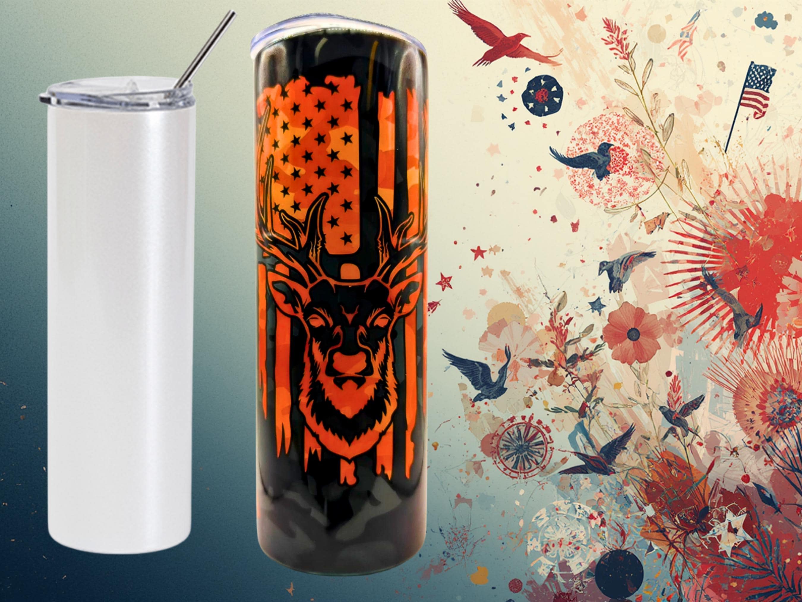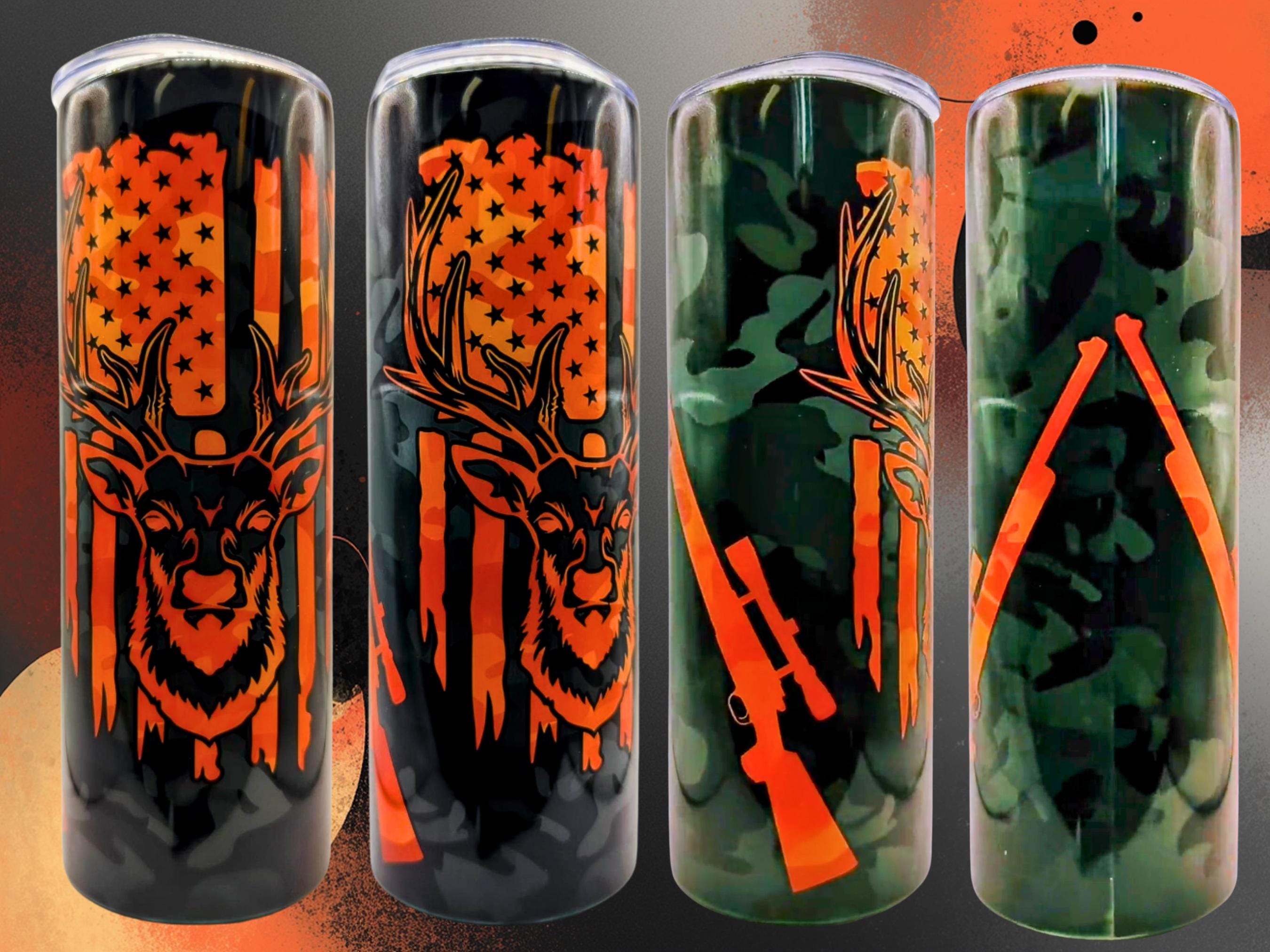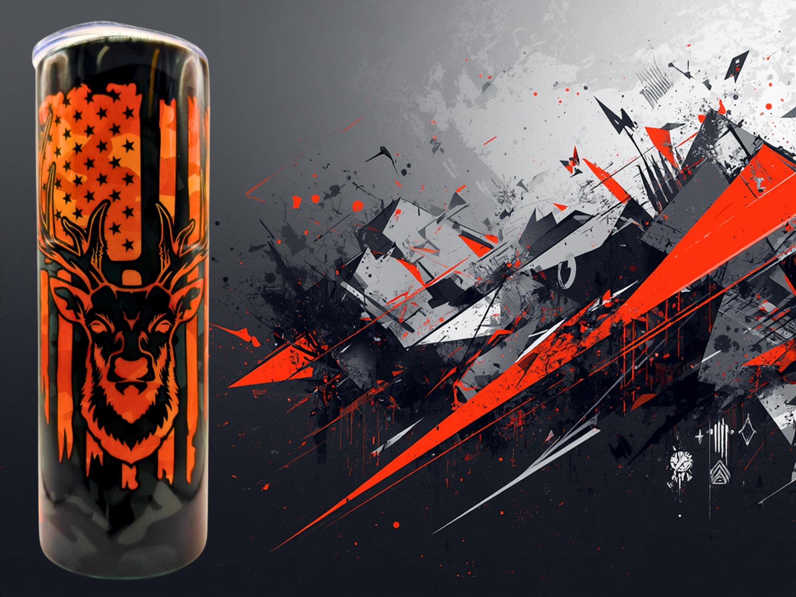 This 20oz hunting tumbler with deer and American flag design is perfect for hunters and outdoor lovers. Featuring a camo background and bold orange details, this stainless steel tumbler keeps drinks hot or cold for hours.