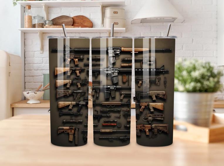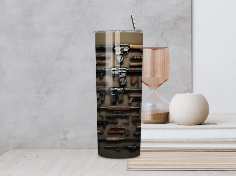 This premium 20oz stainless steel tumbler features a bold tactical design showcasing a detailed firearms wall display. Perfect for gun enthusiasts, military supporters, tactical gear lovers, and Second Amendment supporters.