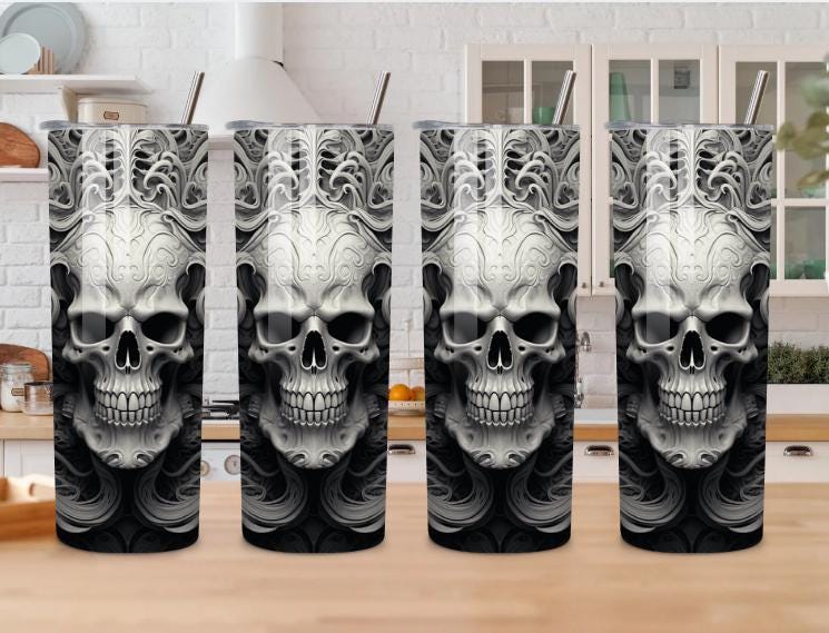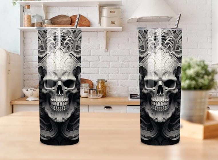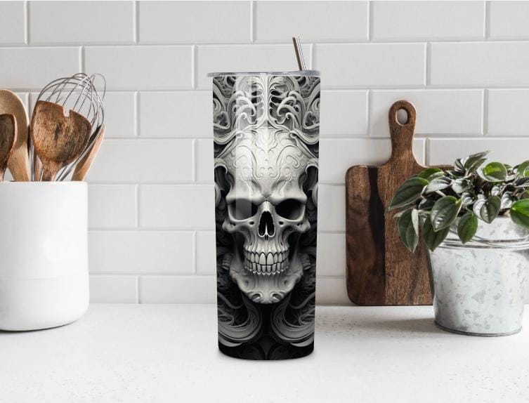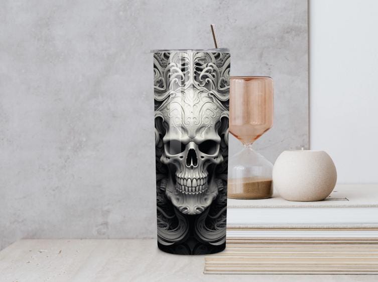 Unleash your dark side with this striking Gothic Skull 20oz Tumbler, featuring an intense black and gray skull design with swirling gothic details. Perfect for fans of dark art, metal, biker, and alternative style.
