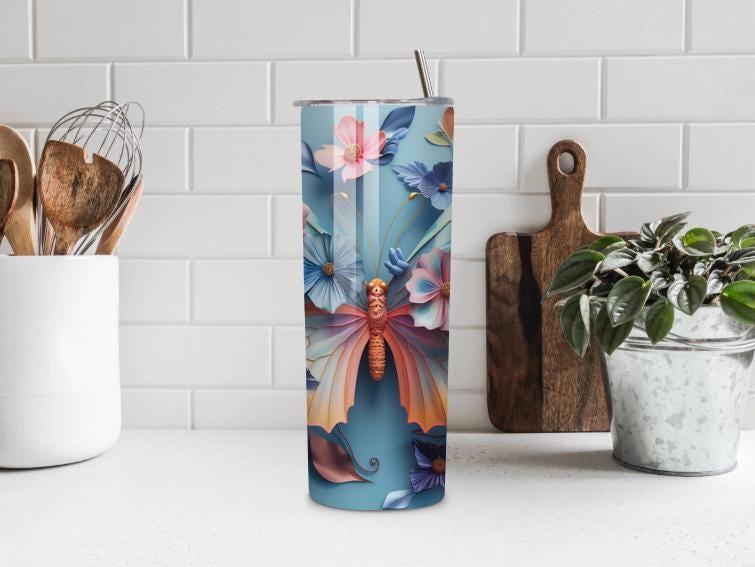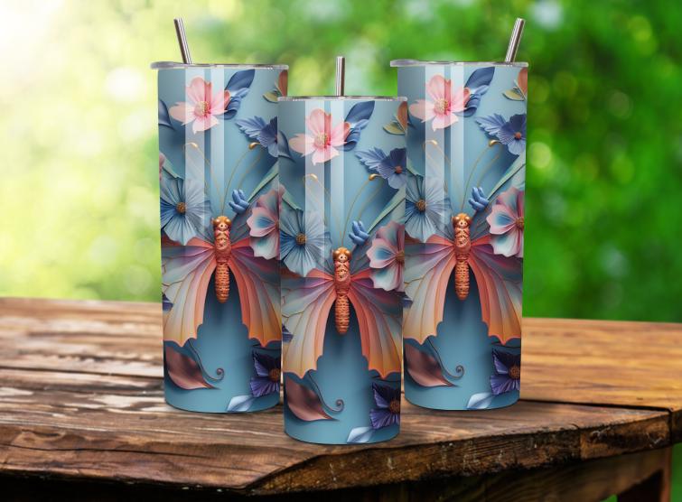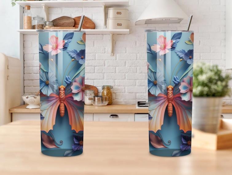 Bring beauty and elegance to your daily routine with this stunning Butterfly Floral 20oz Tumbler. Featuring a vibrant butterfly surrounded by colorful flowers on a soft blue background, this tumbler is perfect for nature lovers and anyone who appreciates artistic drinkware.