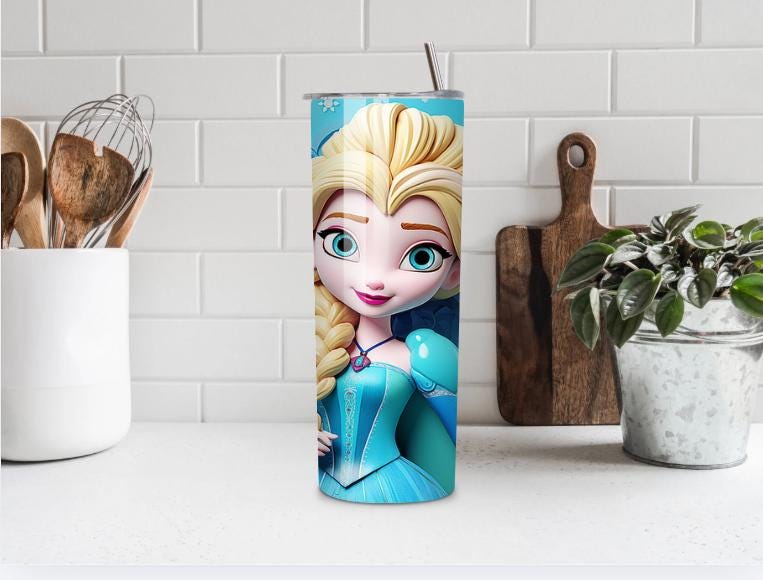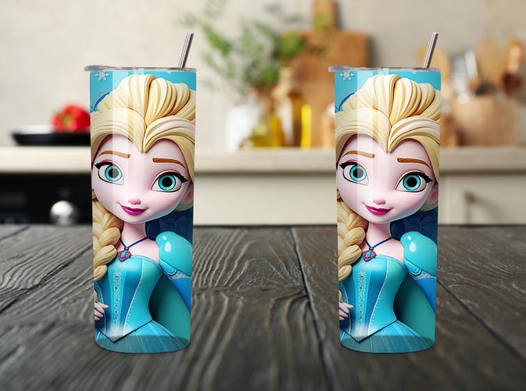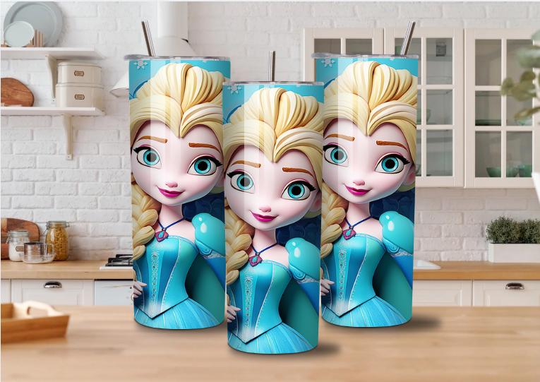 This 20oz skinny tumbler features a beautiful ice princess inspired design with vibrant blue tones, fantasy elements, and colorful details — perfect for kids and anyone who loves magical winter themes.