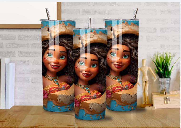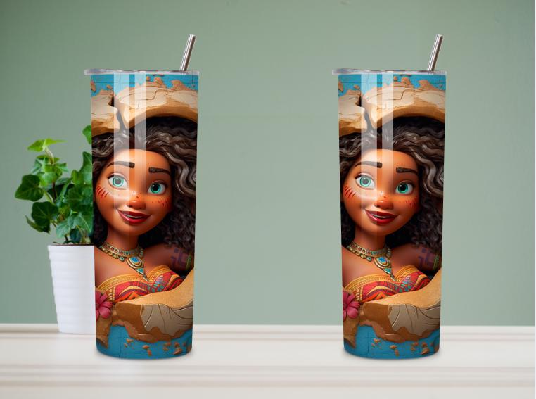 Moana Inspired 20 oz Tumbler, 3D Crack Effect Stainless Steel Skinny Tumbler, Tropical Disney Princess Travel Cup, Gift for Her