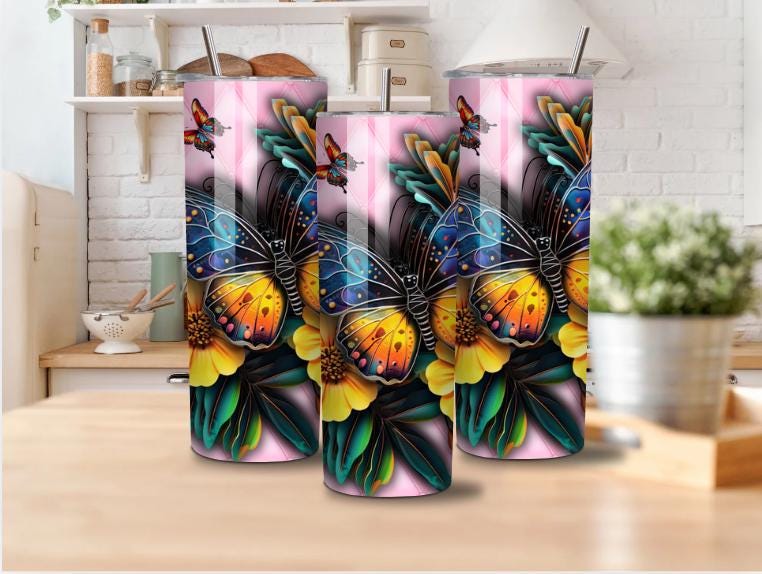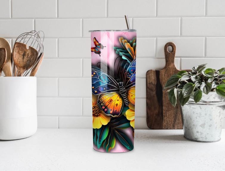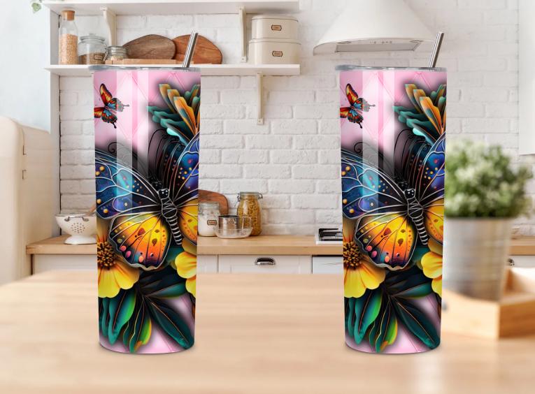 Our 20 oz tumbler, adorned with a multicolored butterfly and vibrant sunflowers, combines style and functionality. The pink quilted background adds an elegant touch. Made of stainless steel, it keeps your drinks hot or cold for hours. Ideal as a gift, it’s durable, easy to clean, and a bright addition to your day with every sip.