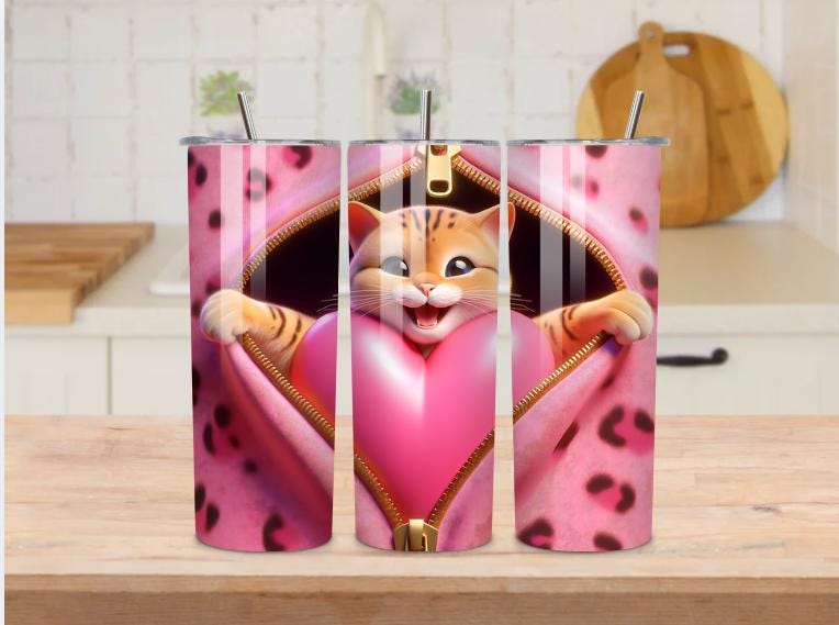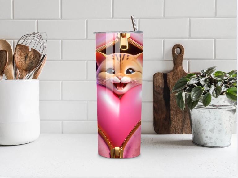 A cute and romantic 20oz skinny tumbler featuring a joyful kitten holding a pink heart. Perfect Valentine gift for cat lovers. Includes lid and straw, durable sublimation print, and double-wall insulation for hot or cold drinks.