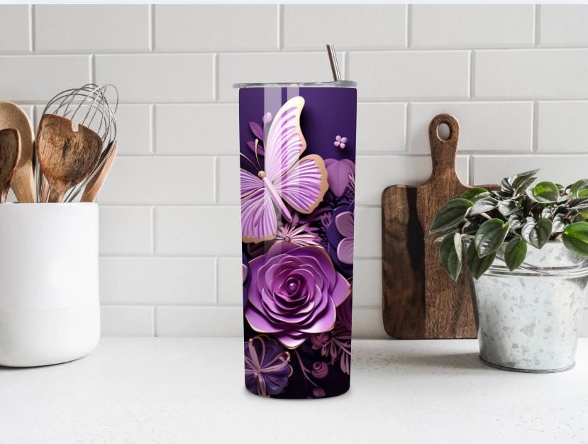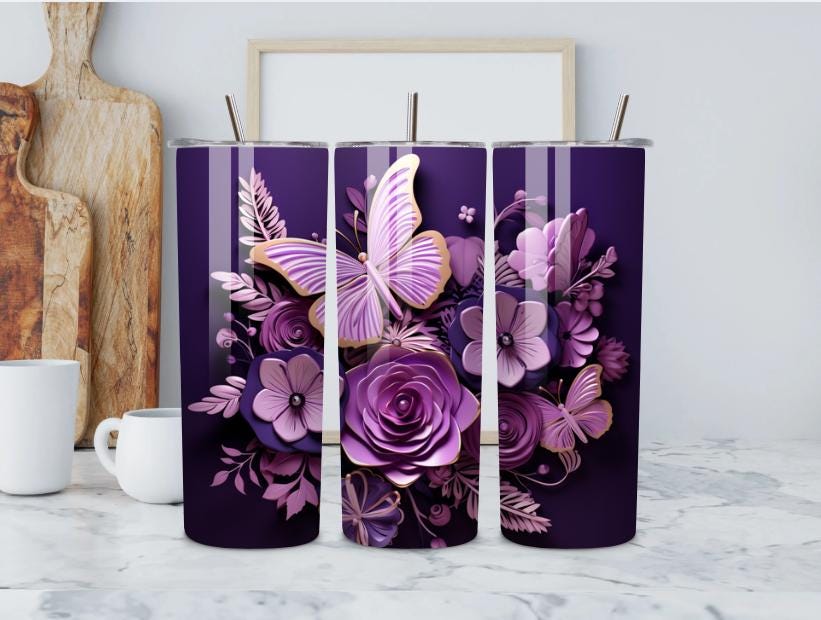 Elegant 20oz stainless steel tumbler featuring purple roses and butterflies. Insulated to keep drinks hot or cold for hours, with a vibrant, long-lasting wrap and spill-resistant lid. A stylish and practical gift for women who love floral designs.